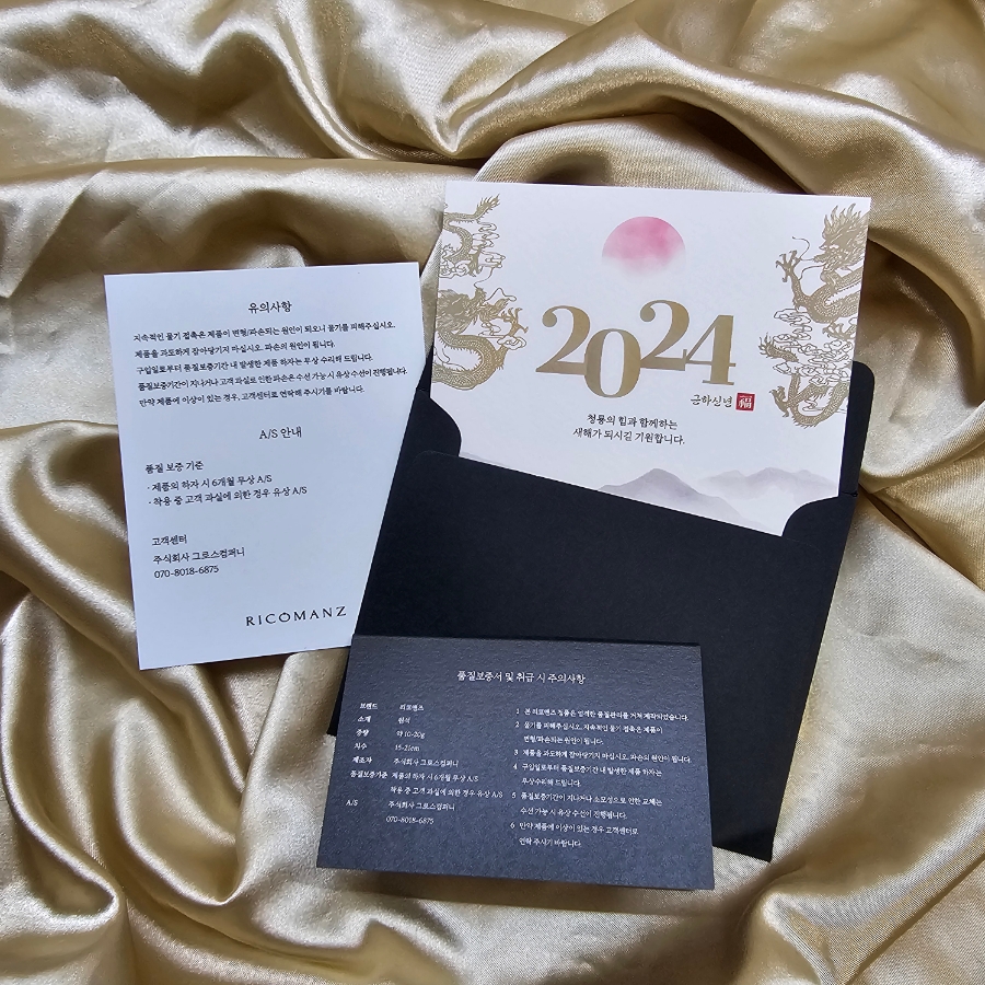 근하신년 카드, 유의사항 및 A/S 안내문, 품질보증서 등이 함께 들어 있어요.