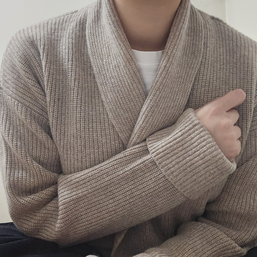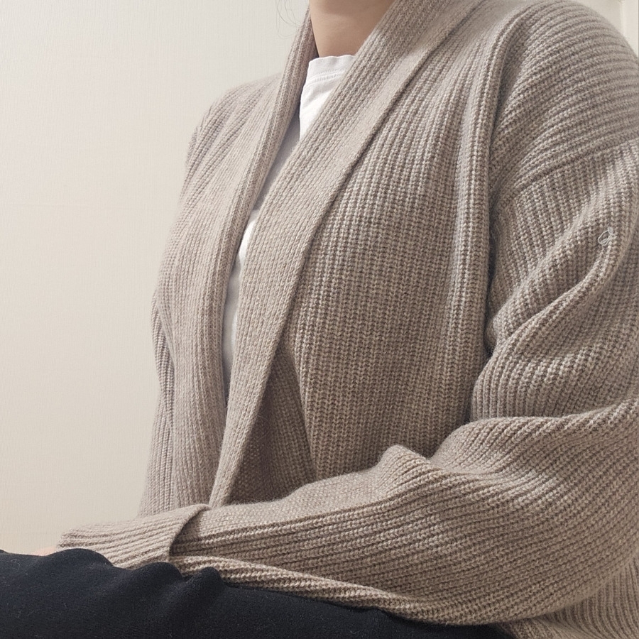 립 조직으로 짜임이 단단하게 잡혀 있어 늘어짐 걱정이 크지 않고, 일반적인 V넥 가디건보다 목이 훨씬 포근하게 감싸지는 느낌이 있습니다.