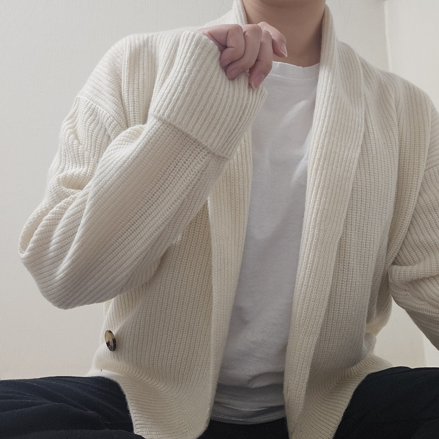 이 가디건은 간단하게 걸쳐도 형태가 안정적으로 잡히는 점이 가장 먼저 눈에 들어옵니다. 숄카라 디자인이 목선부터 자연스럽게 드레이핑되며, 한쪽 버튼으로 여미는 랩 형태가 여유 있는 실루엣을 만들어줍니다.