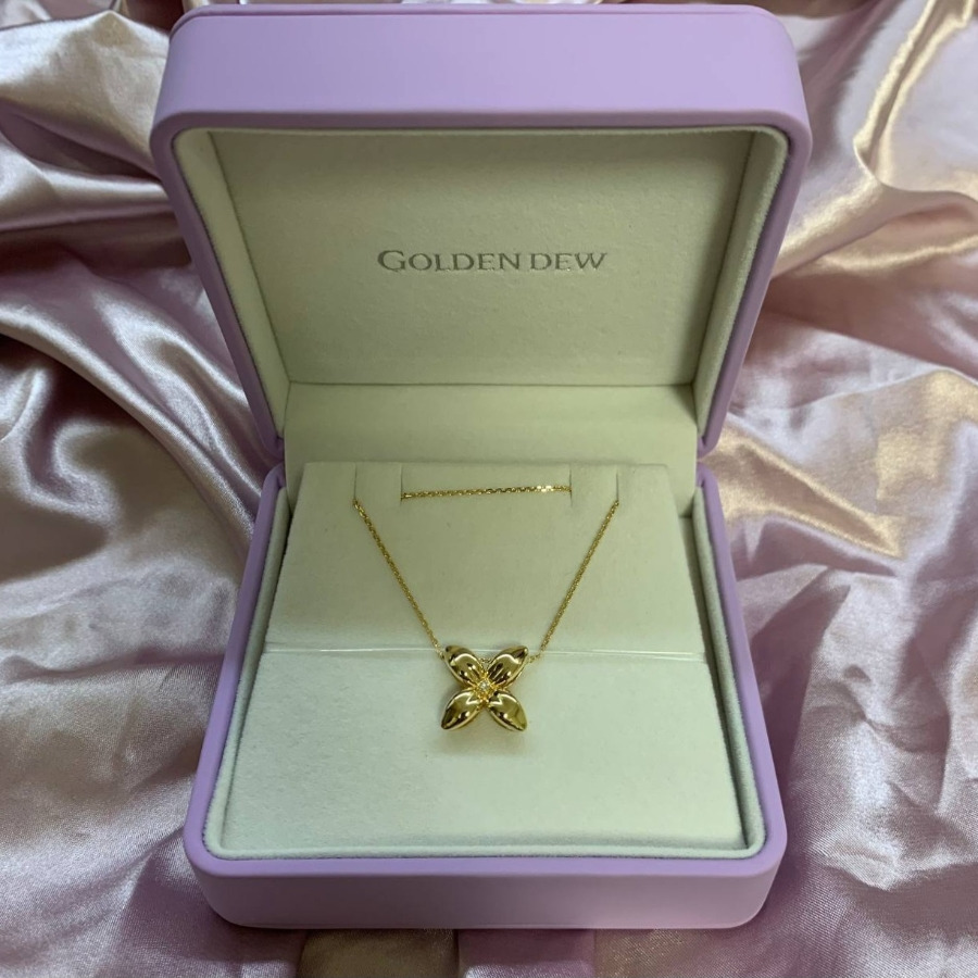 패키지도 골든듀답게 감성적인 분위기가 있었어요. 라벤더 색 박스를 열면 부드러운 패브릭 위에 목걸이가 안정적으로 놓여 있는데, 펜던트가 가장 예쁜 각도로 보이도록 세팅돼 있어 보는 순간 괜히 미소가 지어졌어요.