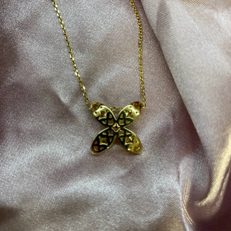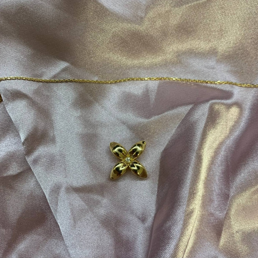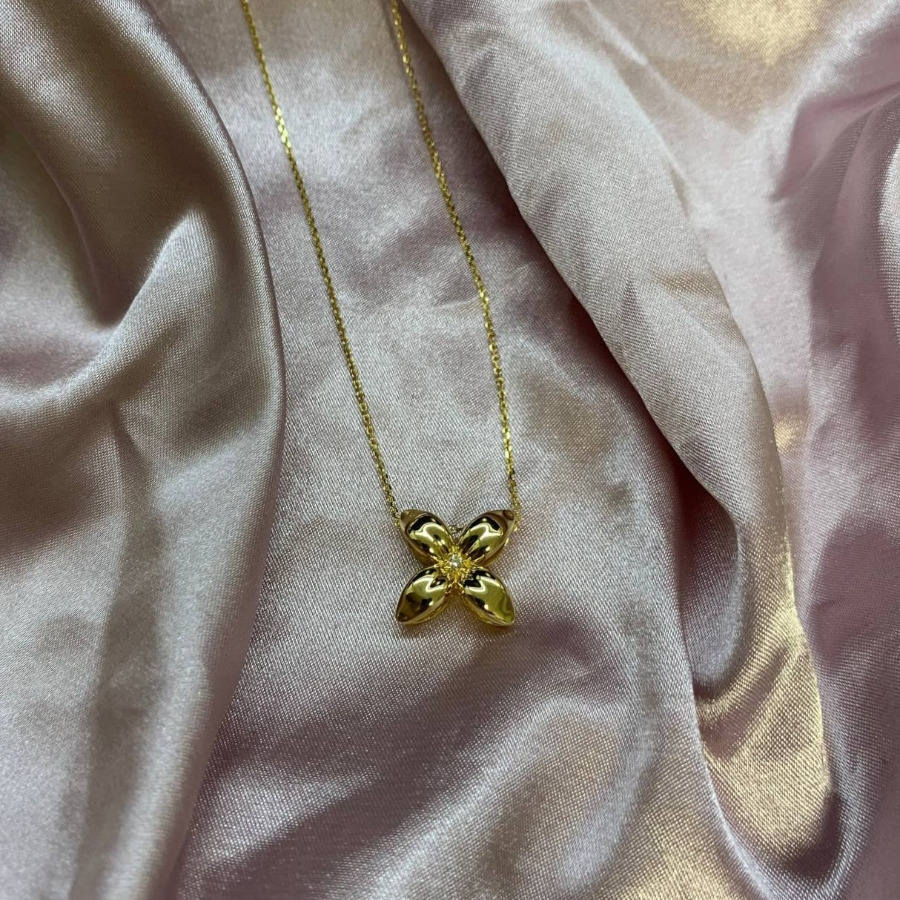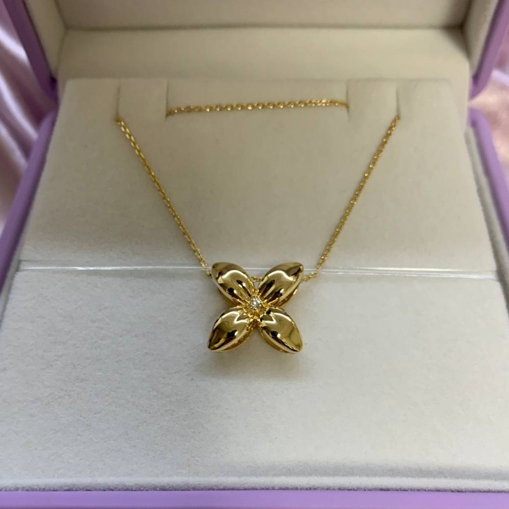네 개의 꽃잎이 유려하게 이어지는 곡선이 금속 표면에서 부드럽게 퍼져 나가는 느낌이라 작고 가벼운 펜던트인데도 분위기가 꽤 세련돼 보였어요.
