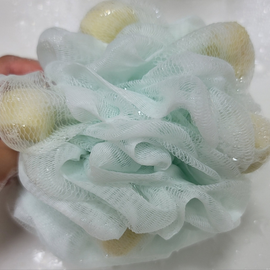 실제 사용해보면 필리밀리 부드러운 샤워볼의 가장 큰 특징은 메쉬 조직의 촉감입니다. 망이 비교적 촘촘하면서도 한 올 한 올이 얇은 편이라 피부에 닿을 때 거칠게 긁히는 느낌이 거의 없어요. 바디워시를 소량만 묻혀도 물과 함께 문지르면 거품이 빠르게 올라오고, 거품이 쉽게 꺼지지 않는 점도 인상적이었습니다. 거품 타입은 크고 거친 느낌보다는 부드럽고 밀도감 있는 편이라, 피부 위에서 문지를 때 자극 없이 감싸주는 느낌에 가깝습니다.