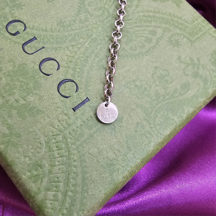 펜던트의 반대면에는 꽃과 새 일러스트가 새겨져 있고, 하단에는 GUCCI 로고가 함께 들어가 있습니다. 앞뒤 모두 디자인 요소가 들어가 있어 어느 방향으로 착용해도 어색하지 않고, 스타일에 따라 양면으로 연출할 수 있다는 점이 특징이에요. 단면만 사용하는 목걸이보다 활용도가 높아 데일리 아이템으로 손이 자주 가는 편입니다.