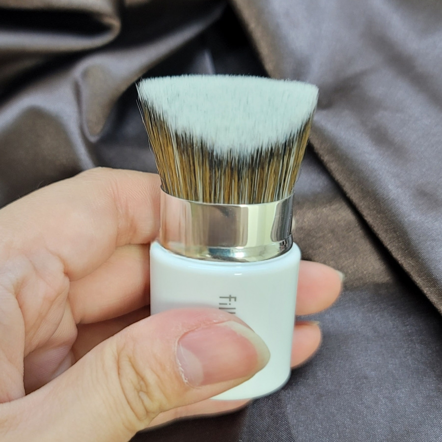 실제로 사용해보면 굴곡진 부위에서 장점이 더 잘 드러납니다. 콧볼 옆이나 눈 밑, 입가처럼 베이스가 뭉치기 쉬운 부분을 중앙의 날렵한 모로 정리하고, 양쪽 면으로 번갈아가며 풀어주기 좋았어요. 퍼프보다 힘 조절이 쉬워서 파운데이션을 소량만 사용해도 균일한 피부 표현이 가능했습니다. 여행 중 간단한 베이스 메이크업을 할 때 활용도가 높게 느껴졌어요.