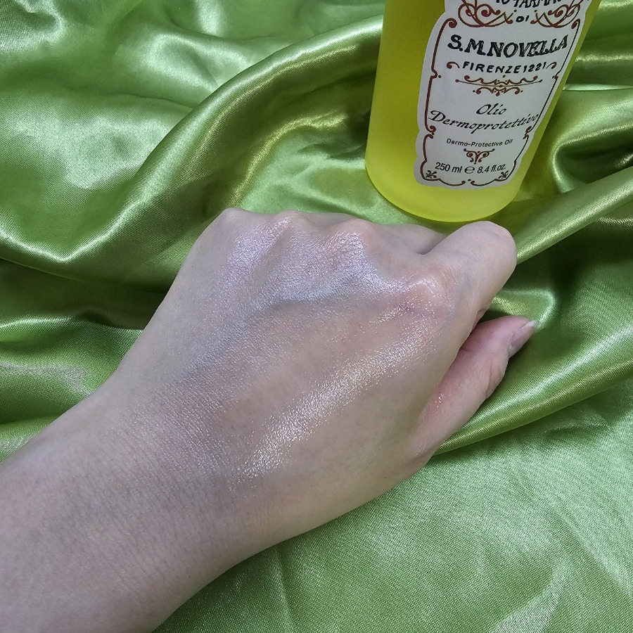 산타 마리아 노벨라 올리오 데르모프로텍티보는 전신용 바디오일로 샤워 후 사용을 기본으로 합니다. 투명한 오일 타입이며 보틀 디자인은 브랜드 특유의 클래식한 약국 감성이 그대로 드러납니다. 화려함보다는 차분하고 정제된 느낌이 강하고, 욕실이나 화장대에 두었을 때 튀지 않는 디자인이에요. 펌프형이 아닌 일반 보틀 타입이라 손에 덜어 사용하는 방식인데, 이 점은 익숙해지면 크게 불편하지 않지만 처음에는 사용량 조절에 약간의 신경이 필요합니다.