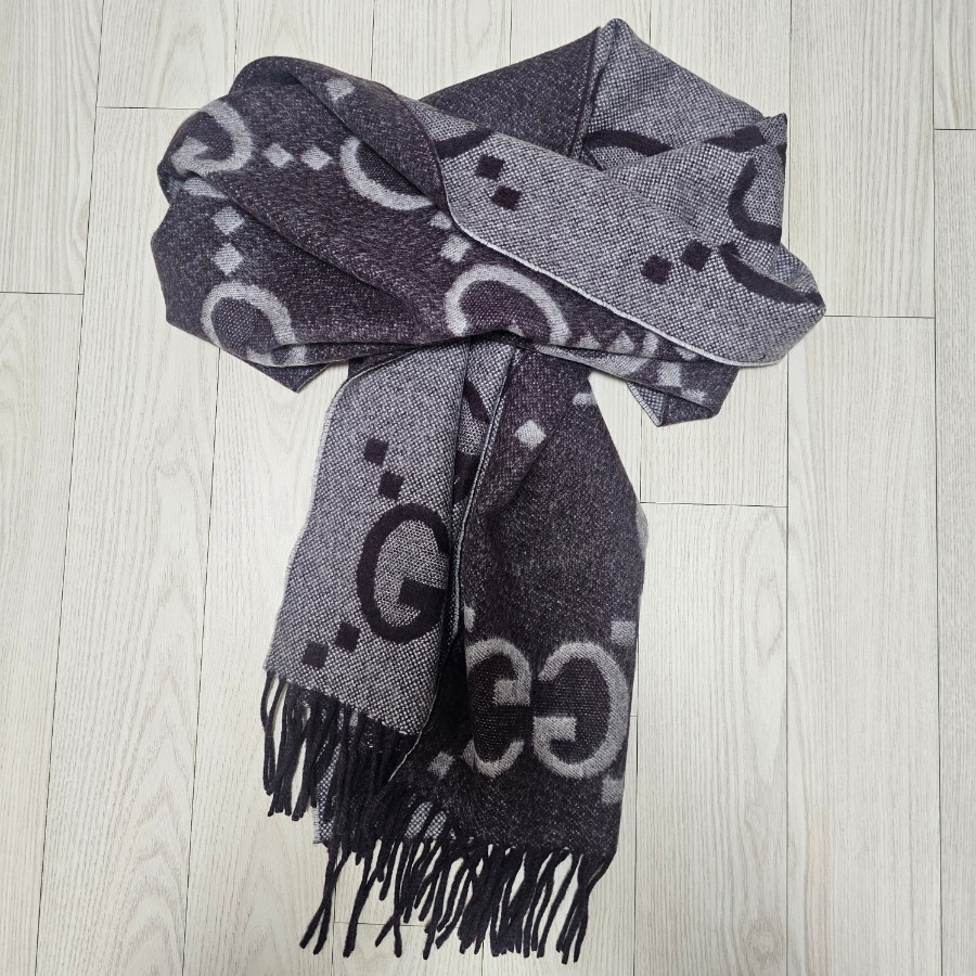 퍼플 톤 바탕에 GG 모티브가 반복 배열되어 브랜드 아이덴티티가 분명하게 표현됩니다. 가까이서 보면 캐시미어 표면에 은은한 기모감이 살아 있고, 전체적으로 매트한 질감이라 고급스러운 인상을 줘요. 로고 패턴이 크고 선명해 존재감은 확실한 편입니다.